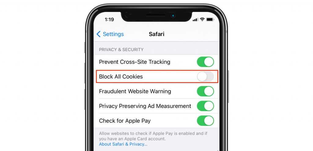 В Safari для iPhone есть простой переключатель для включения и выключения файлов cookie. Вы можете получить доступ к этой опции следующим образом: