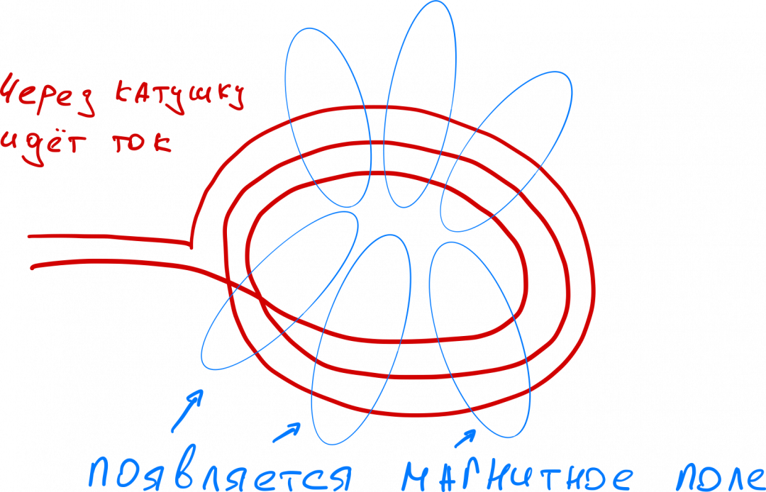 Когда на первой катушке появляется ток, вокруг неё образуется магнитное поле, которое передаёт его на вторую.