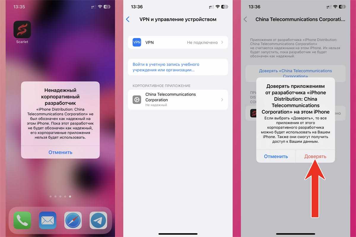 4. После загрузки программы перейдите в Настройки – Основные – VPN и управление устройством и подтвердите использование нового сертификата для приложения.