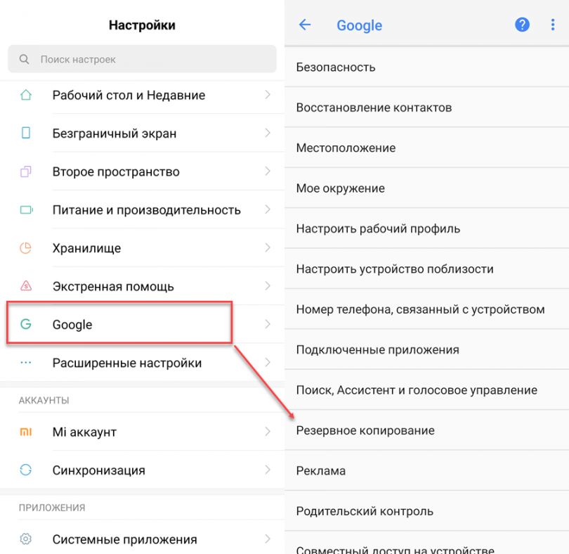 Шаг 1. В настройках найдите пункт «Google» и в открывшейся странице выберите «Резервное копирование».
