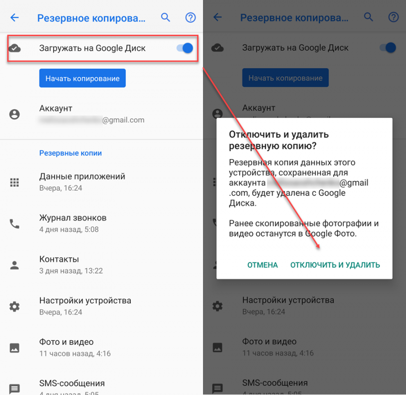 Шаг 2. Если вы хотите удалить данные не только со смартфона, но и с Google Диска, то передвиньте ползунок в состояние «Выключено». После этого нажмите «Отключить и удалить». Будьте внимательны, после этого получить доступ к резервной копии устройства никак не получится.