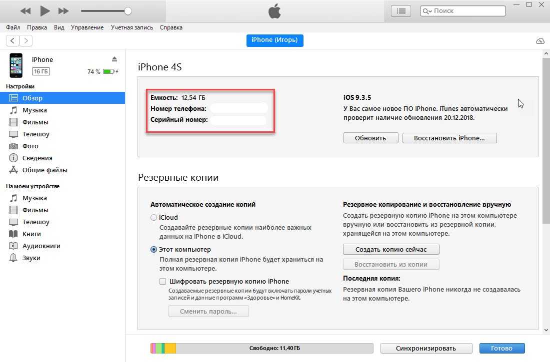 Через несколько секунд на экране появится весь статистический набор – и IMEI и номер телефона, и различные серийники. Вариант, по сути, беспроигрышный, но узконаправленный – не все в принципе используют iTunes в повседневной жизни, и уж тем более создают резервные копии (да и зачем? Доступ к музыке всегда открыт через Apple Music, а все важное и полезное в два счета переносится в iCloud).
