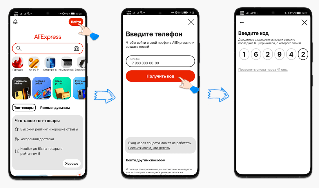Регистрация в приложении очень проста, приложение само проведёт вас пошагово по всем этапам. Всё, что вам понадобиться, это всего лишь после запуска приложения ввести номер телефона, а затем ввести проверочный код из СМС, который Алиэкспресс отправит на введённый вами номер.