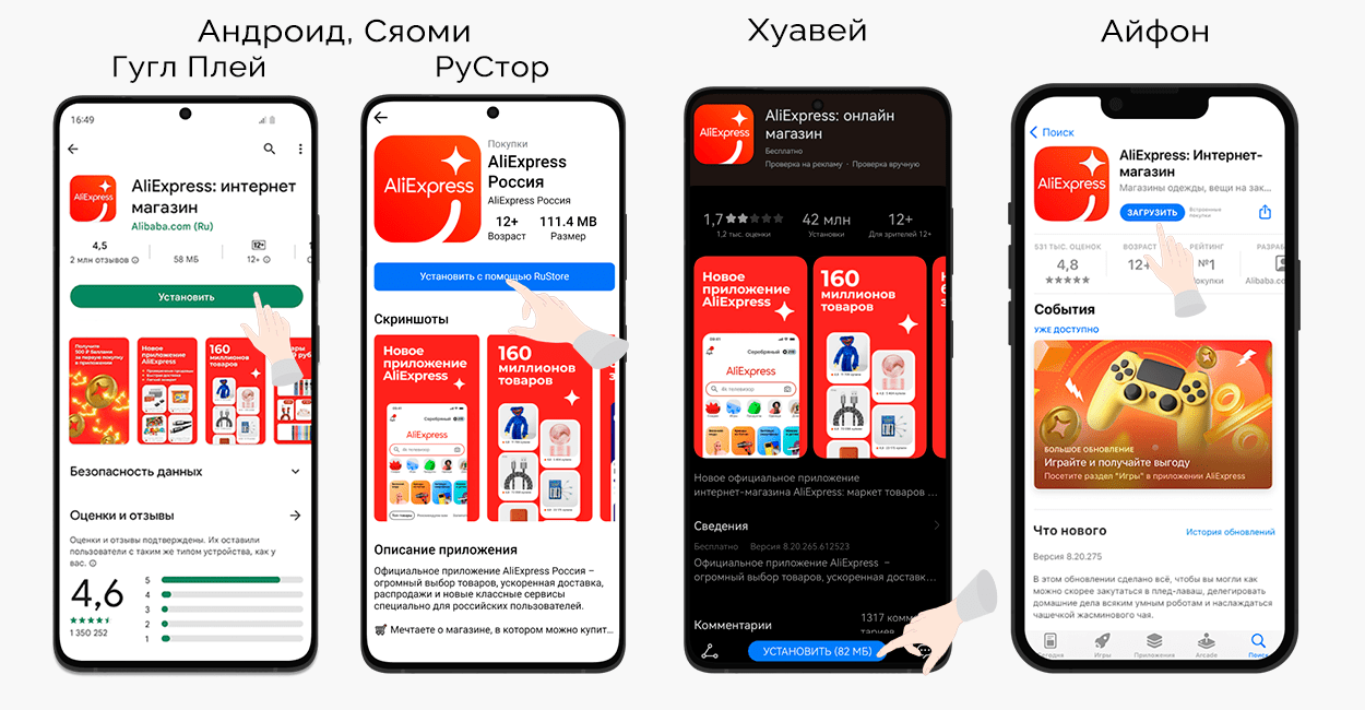Aliexpress имеет своё собственное приложение для жителей России. Скачать официальное приложение алиэкспресс бесплатно и без регистрации вы можете по следующим ссылкам, если у вас айфон, андроид, хуавей. Если у вас установлен рустор. После перехода по подходящей для вас ссылке, нажмите на кнопку «Установить». Подождите пока приложение установится на телефон и откройте его.