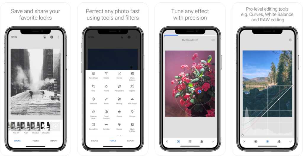 В дополнение к нескольким фильтрам, которые Snapseed называет Looks, есть огромный выбор инструментов редактирования. Они варьируются от основ до сдвига перспективы, выборочной окраски, мгновенного HDR и обширных монохромных фильтров и опций. Приложение тоже хорошо управляет. Просто перетащите влево и вправо, чтобы настроить силу параметра, или перетащите вверх и вниз, чтобы изменить параметр.