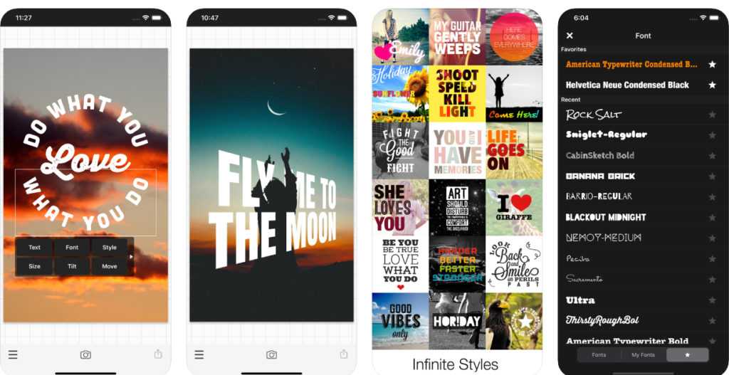 Простое и легкое приложения для наложения текста на фото. Ничего лишнего. В базе больше 400 шрифтов. Из минусов – для кириллицы доступны не все шрифты. Но можно скачать и установить свои шрифты.