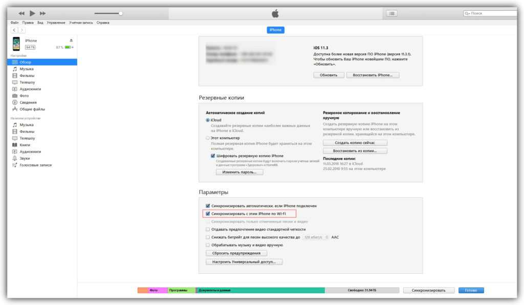 - Проверяем, что в правой части окна раздел «Синхронизировать с данным устройством по Wi-Fi» помечен флажком. Если флажка нет, то отмечаем его.