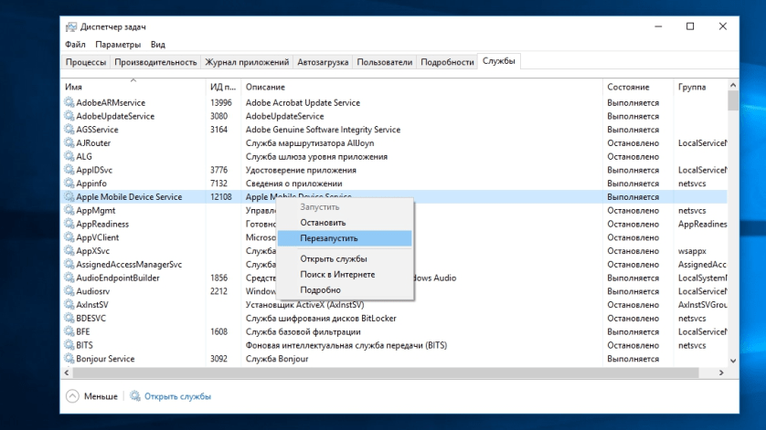 Необходимо от компьютера отключить Айфон и закрыть Айтюнс перед выполнением данного шага. Сейчас необходимо перезапустить службы Apple, так как они могут давать сбои.