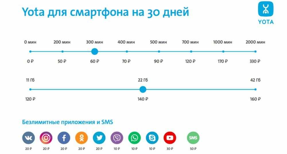 Тариф для смартфонов от Yota не имеет конкретных условий. Абонент может сам определить объём пакета исходящих минут и размер ежемесячной платы. Чем больше услуг включает тарифный план, тем дороже он будет стоить. Например, самая дешевая версия тарифа будет стоить 440 рублей в месяц, а самая дорогая 1890 рублей (в большинстве регионов цены ниже). У вас есть возможность выбрать нужное вам количество минут для звонков на номера других операторов России (300, 500, 1000, 2000, 3000), а также подключить безлимитные SMS за 50 руб. в месяц или отказаться от этой услуги. Остальные условия изменить нельзя.
