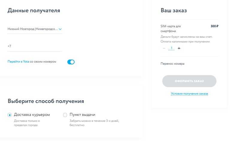 Жмите на кнопку «Заказать СИМ-карту». Здесь внесите предложенные данные — город и телефон. Укажите, планируете ли вы подключить безлимитный Интернет на Yota и перейти на него со своим номером. Выберите способ получения — курьером (доставляет СИМ в пределах населенного пункта) или в пункте выдачи (можно забрать карточку самостоятельно в течение трех суток).