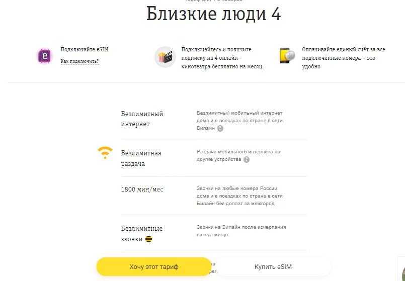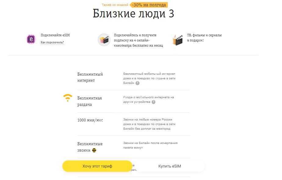 В этом тарифе также доступен безлимитный мобильный Интернет Билайн без ограничения. К особенностям плана стоит отнести: