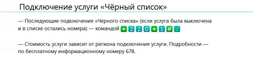Функция наполнения черного списка через «Личный кабинет» в настоящее время не работает. На странице опции в панели управления услугами можно только ознакомиться с инструкцией по использованию, условиями тарификации и посмотреть список уже имеющихся номеров.