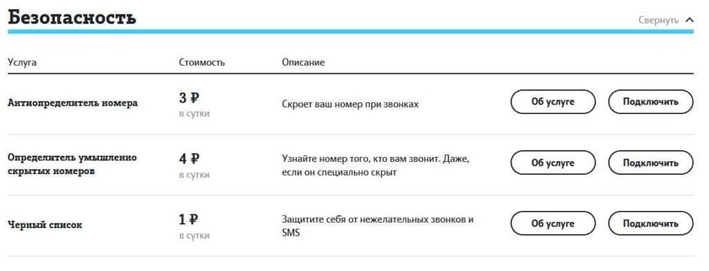 Подключить услугу можно и при помощи личного кабинета. Для этого войдите в него и перейдите в раздел услуг. В главе “Безопасность” вы найдете желаемое. Нажмите на кнопку подключения напротив надписи, чтобы подключить нужную опцию.