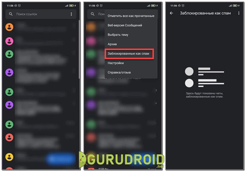 По умолчанию все сообщения отображаются в списке всех диалогов. Только послания от заблокированных номеров, как правило, помечаются специальным значком. Но если вы не активировали такую настройку, то воспользуйтесь пошаговой инструкцией: