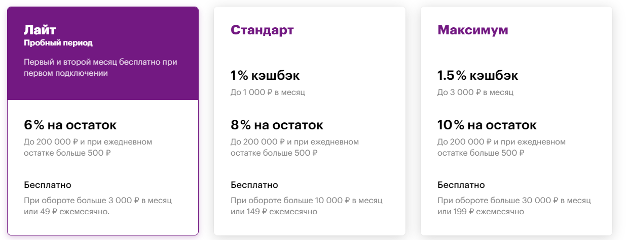 - Для тарифов Стандарт и Максимум существует ещё и кэшбэк. Он тоже не очень большой, от 1 до 1,5%, но вкупе с начислением процентов на остаток получается выгодно.