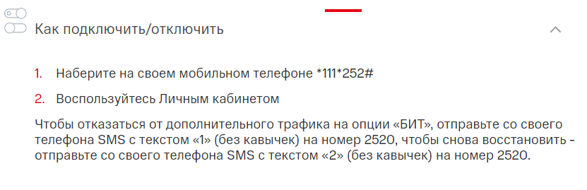 Добавочные пакеты на опции БИТ можно не использовать или вовсе от них отказаться – для этого нужно отправить сообщение, с текстом «1» на номер 2520. Восстановление услуги – SMS, с текстом «2» на номер 2520.