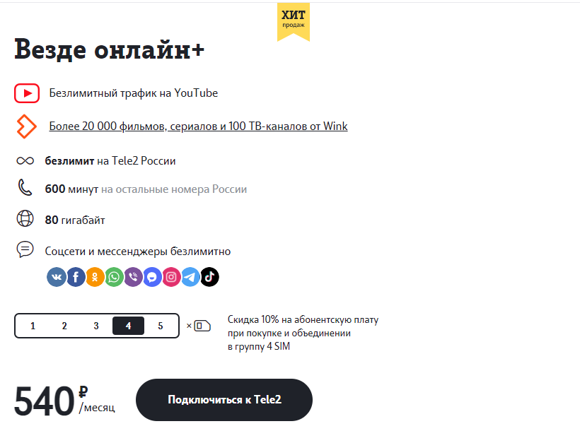 Во многом схож с предыдущим тарифом, с той разницей, что на прочие расходы (помимо мессенджеров) выделено 80ГБ. Также это предложение выгодно отличается от «Везде онлайн» неограниченным трафиком на Youtube и возможностью подписки на видеосервис Wink.