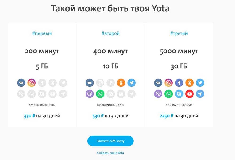 Для большинства людей мобильная связь постепенно уходит на второй план. Теперь человечество переходит на интерактивные способы общения с помощью интернета. Тарифы от Ета для смартфонов не обладают какими-либо лимитами по количеству интернета и предполагают самостоятельную настройку всех необходимых минут и трафика на месяц. На официальном сайте это находится в разделе «Собери свою Yota».