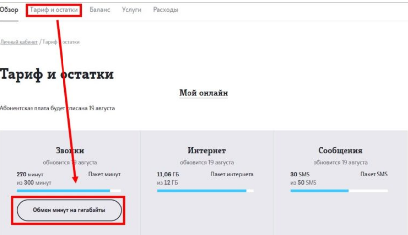 Нужно также найти пункт меню «Тарифы и остатки» и перейти на опцию, которая осуществляет обмен голосового времени на пакет интернета. Затем перед вами откроется страница с условиями опциями. Введите желаемое значение минут и подтвердите своё намерение.