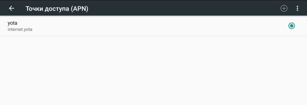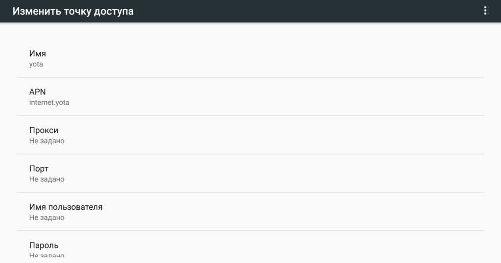 В поле «Точка доступа/APN» — internet.yota без каких-либо дополнительных символов.
