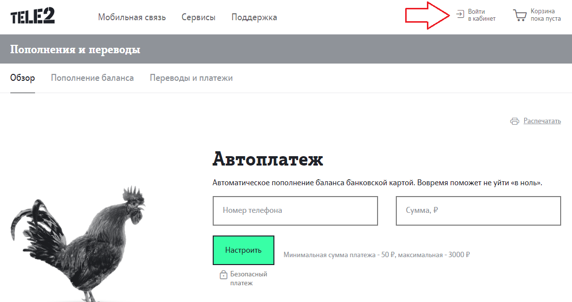 Чтобы использовать возможности Теле2 для отключения сервиса, нужно отправиться в личный кабинет, найти который можно на официальном сайте оператора https://tele2.ru/. С главной страницы выполняется переход в специальный подраздел услуг, где можно просмотреть активные подключения клиента. Здесь имеется возможность отключать автоматические платежи, а также отвязывать карточку банка от сервиса.