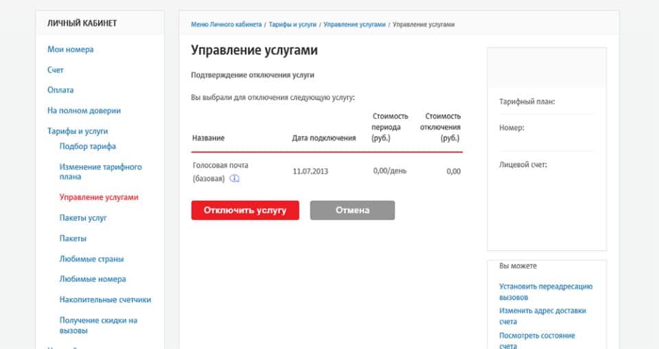- на открывшейся странице можно произвести отключение Голосовой Почты на МТС, нажав на «отключить» напротив ненужной опции.