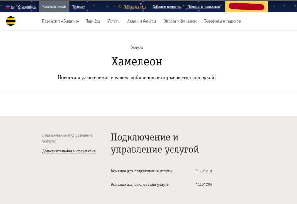 . Также подключение и отключение «Хамелеона» доступно в меню «Билайн» сотового телефона — надо просто выбрать соответствующие пункты, после чего следовать указаниям оператора. Сообщения, посылаемые при этом, не тарифицируются (плата за них не снимается).