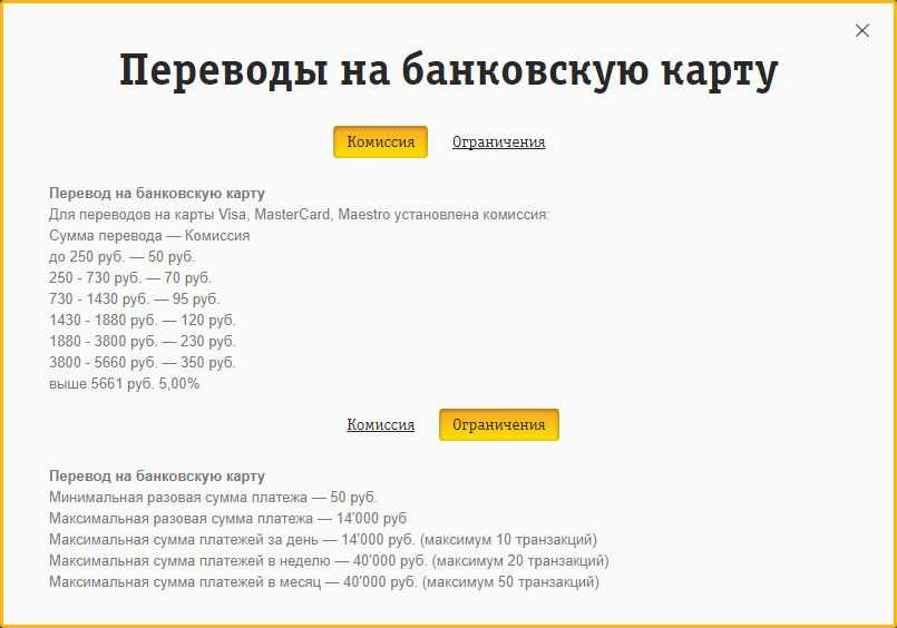 Комиссии и ограничения суммы при переводе на банковскую карту
