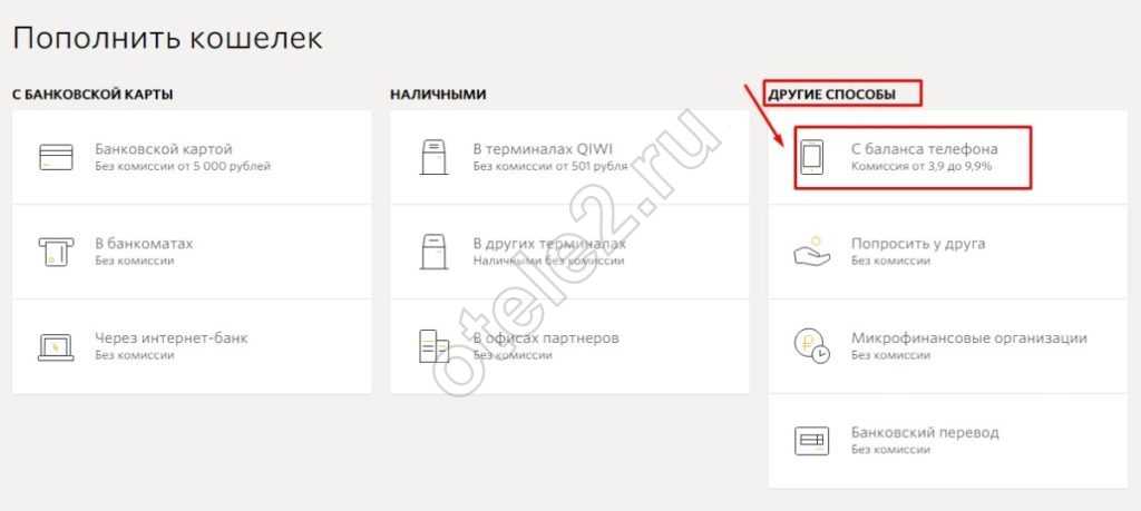 - на экране отобразятся способы пополнения: «С банковской карты» , «Наличными» и «Другие способы». Чтобы перевести с Теле2 на Киви, необходимо выбрать пункт: «Другие способы», далее выбрать «Баланс телефона»;