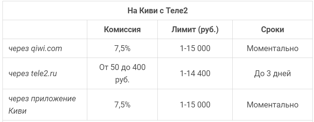 Перевод с Теле 2 на Киви через QIWI Wallet происходит моментально, комиссия составляет 7,5%, а лимит — 15000 рублей. Такие же условия и при переводе с Теле 2 на Киви через мобильное приложение. При переводе через интернет сайт tele2.ru пользователю придётся заплатить комиссию от 50 до 400 рублей, ждать результата в течение 3 дней. Лимит при этом составляет 14400 рублей.