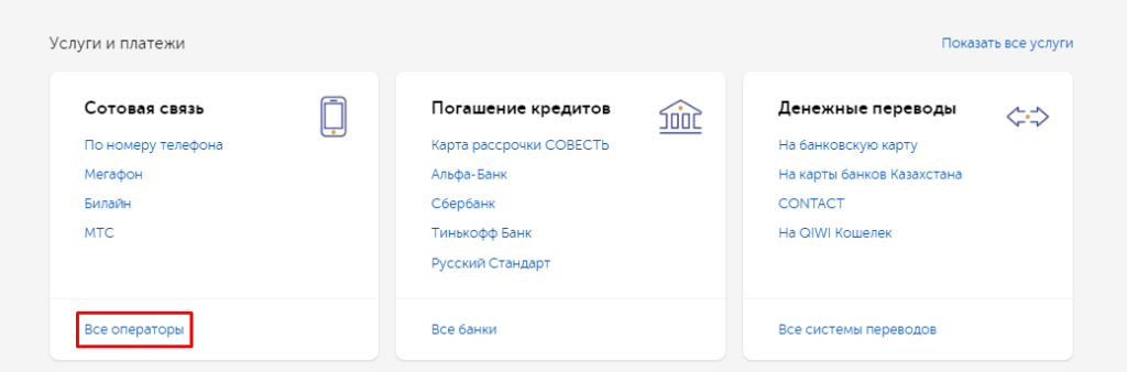 - На экране появится панель со списком сервисов. Нам нужен “Переводы и платежи” (третья колонка).