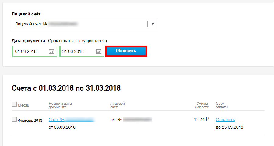 Если в открывшемся окне информация не отображается, тогда выбрать нужный ЛС, указать промежуток времени и нажать кнопку «Обновить»