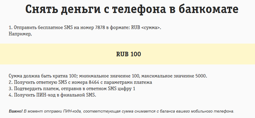 - Отправьте SMS-сообщение с текстом RUB и суммой для снятия на номер 7878;