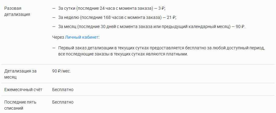 Предоставляется подробная расшифровка звонков и других действий, а также списаний и начислений на календарный месяц. Услугу можно подключить на постоянной основе.