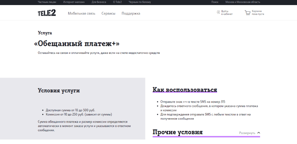 Перейдите на сайт «Теле2» и нажмите на кнопку получения «Обещанного платежа».