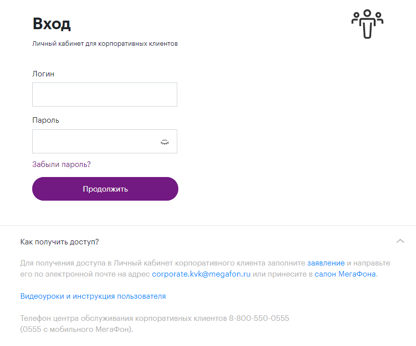 Откроется окно для ввода данных, где после получения доступа к своей учетной записи (после заполненного и одобренного запроса) вам необходимо будет войти в систему, введя свой логин и пароль в соответствующие поля. Для доступа вам необходимо отправить заявку по электронной почте или факсу либо заполнить ее в любом офисе МегаФона, придя туда с необходимыми для заполнения документами.