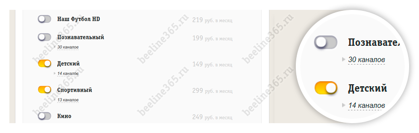 Далее, содержатся сведения о домашнем телевидении Билайн – название тарифа, характеристики подключенного оборудования, размер абонентской платы и список каналов. При необходимости, здесь можно включить отдельные группы каналов, а также заказать бесплатное подключение до 3х дополнительных телевизоров к цифровому ТВ.