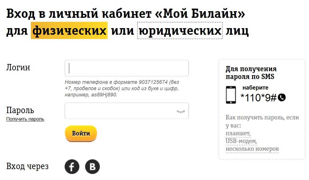 Клиентам Билайна доступен вход в ЛК по логину (номер телефона без 8 или +7) и паролю (предоставляется оператором при заключении договора).