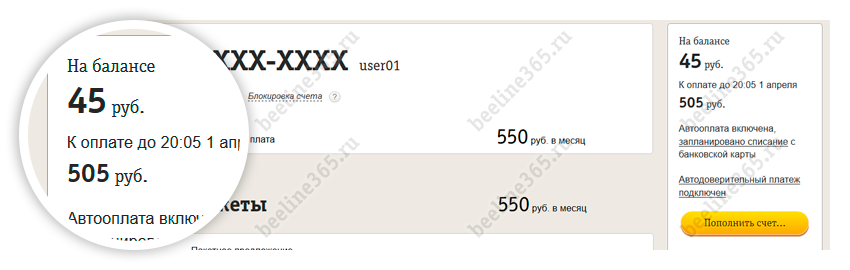 Вся информация о вашем лицевом счете находится на самом видном месте – вверху главной страницы кабинета. Здесь можно посмотреть, сумму абонентской платы, когда произойдет ее следующее списание и до какого числа необходимо оплатить счет; подключить автооплату или автодоверительный платеж, взять доверительный платеж Билайн или пополнить счет с банковской карты. Рядом, указан номер лицевого счета и стоимость отдельных услуг.