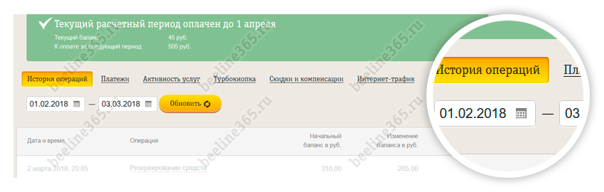 «Детализация» – пункт меню, в котором представлена подробная информация о последних списаниях с лицевого счета. Детализацию можно отрегулировать по определенному периоду.