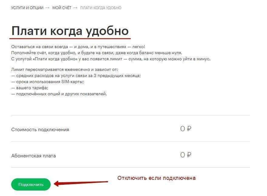 МегаФон за предоставленный лимит не взимает денег, а выделяет на постоянной основе бесплатно. В случае, если баланс становится нулевым, только тогда услуга начинает свое действие. При пополнении счета вовремя, отключать сервис не обязательно.
