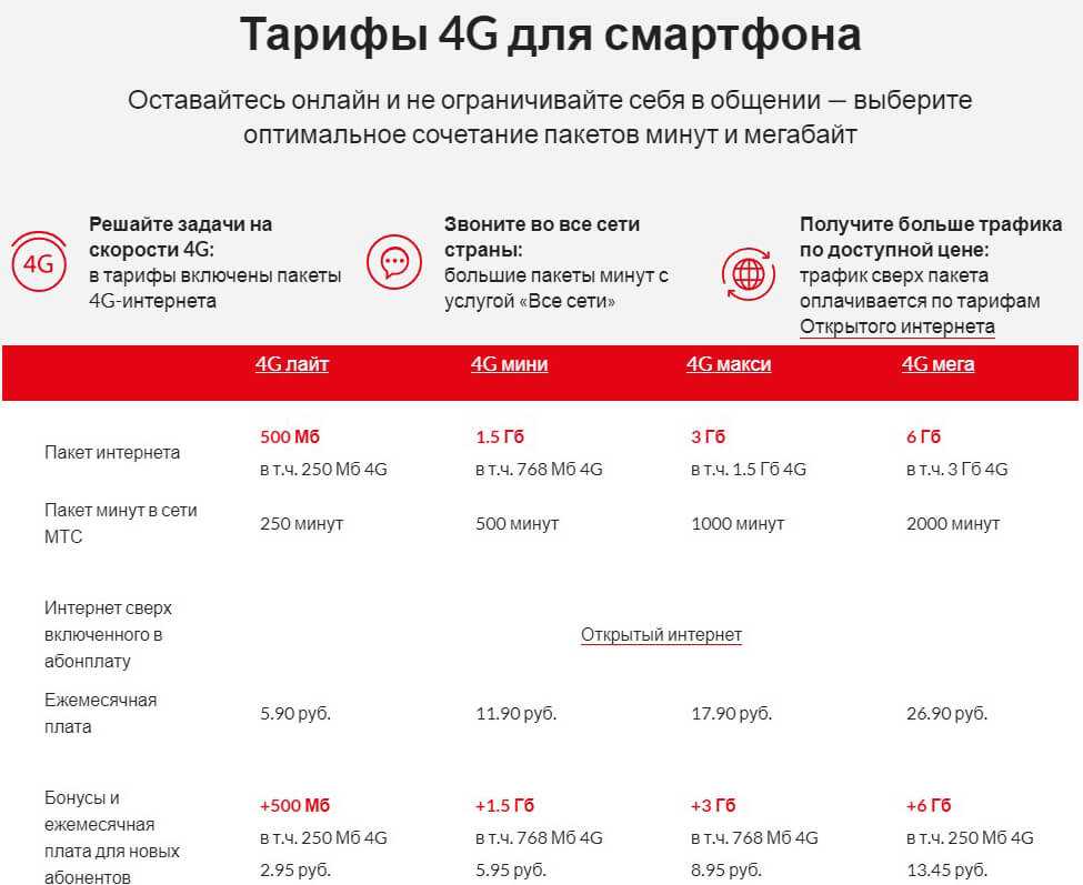 - 4G Мини. За ежемесячную плату размером 11,90 рубля абонент получает 1,5 гигабайт свободного трафика, который можно расходовать на любые ресурсы, а также 500 минут на звонки потребителям услуг компании МТС. Если вы выйдете за рамки стандартной квоты, то одна минута будет стоить 0,0325 руб. Ежемесячная плата будет списываться каждый расчетный срок в дату подключения.