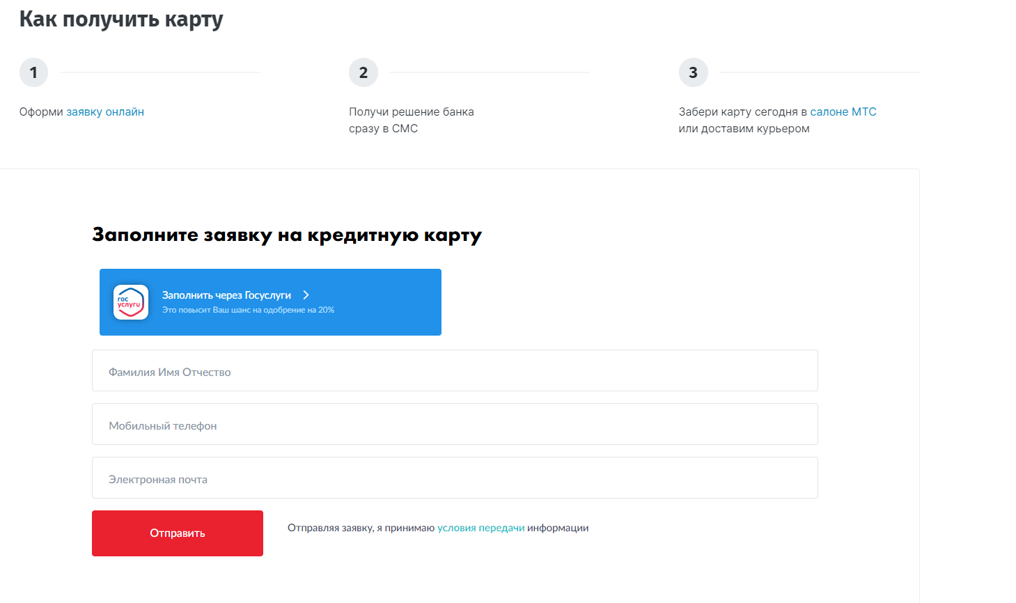 На заключительном этапе приходит SMS от банка с окончательным решением по данному вопросу. В случае положительного решения карточку можно забрать в банковском отделении, салоне связи МТС или через курьерскую доставку.