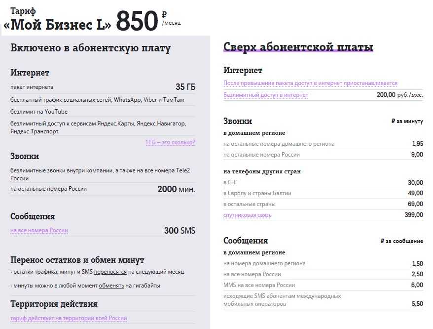 Звонки внутри компании и на номера Tele2 не ограничены. Для остальных участников отводится 2000 минут. Их остатки можно перенести на следующий месяц или перевести в интернет-трафик.