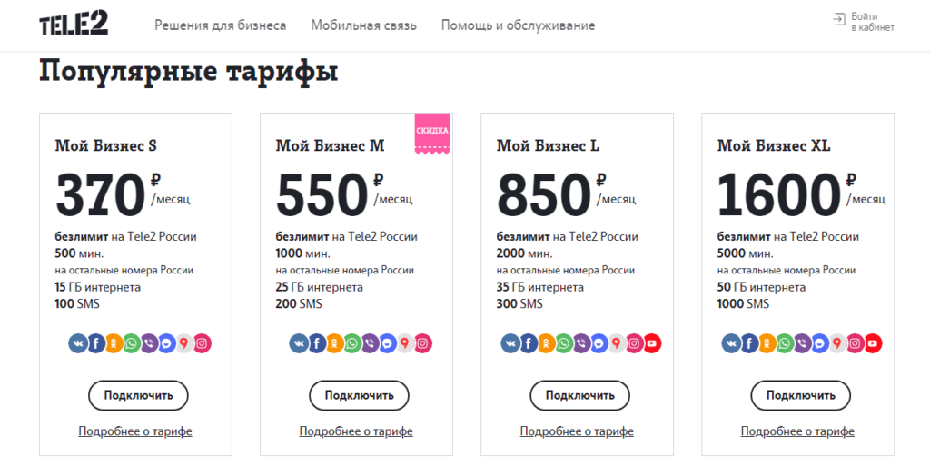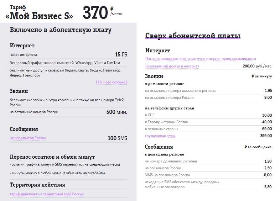 | Тариф на Теле2 «Мой бизнес S» | 15 | 500 | 100 | 370 |