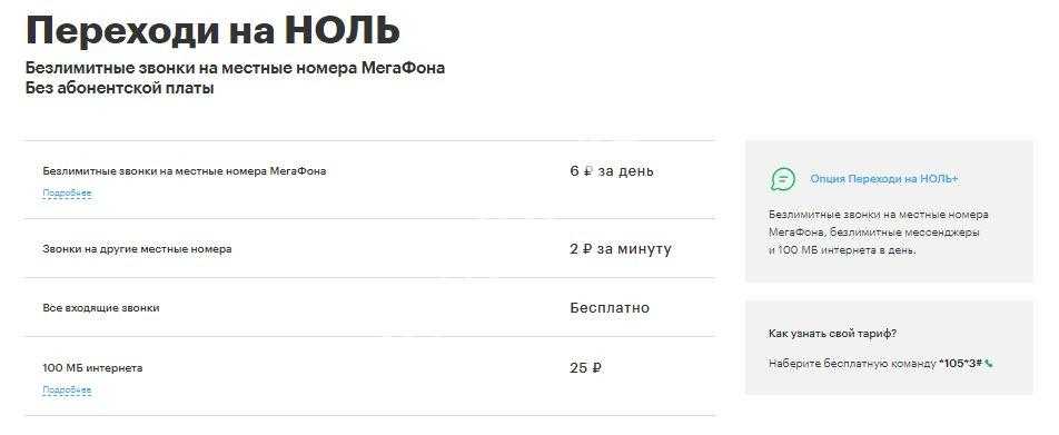 «Переходи на НОЛЬ+». Ах, да! Абонентская плата на тарифе изначально имеется – 6 рублей в сутки. Новая опция «Переходи на НОЛЬ+» предоставляет безлимитные звонки на местные номера Мегафона, 100 Мб мобильного интернета в сутки, а также безлимитный трафик для WhatsApp, Viber, Facebook Messenger, Snapchat, eMotion и ТамТам.