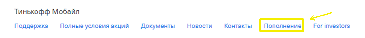 На сайте tinkoff.ru есть специальный онлайн-сервис, с помощью которого можно пополнить счет Тинькофф Мобайл и других операторов. Чтобы перейти к нему, вам нужно открыть раздел «Мобайл», затем пролистать страницу до низа, и в нижнем меню вы увидите подраздел «Пополнение».