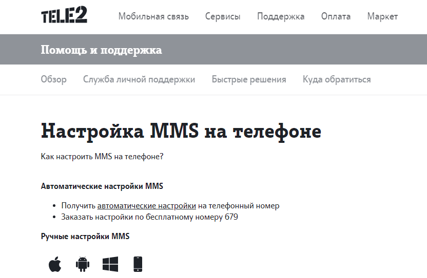 Если появились трудности в настройке ммс провайдера Теле2, нужную конфигурацию можно получить самостоятельно в личном кабинете на официальном портале компании. Инструкция: