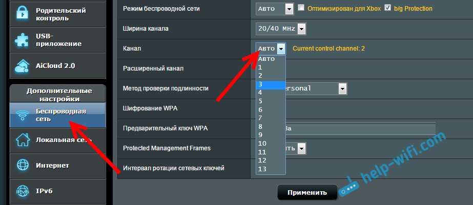 - Смените номер канала. Иногда часто происходящие обрывы порождаются повышенной нагрузкой на конкретный канал. Чтобы его сменить, откройте веб-интерфейс и выберите опцию автовыбора из выпадающего перечня. Там также можно указать иную цифру, если известно, что соответствующий ей канал не занят другим аппаратом;
