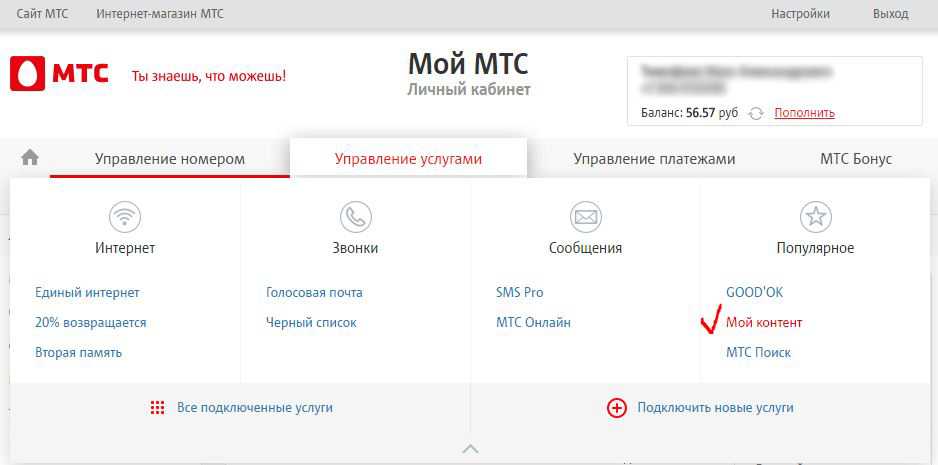 После того как абонент решил подключить «Безлимитище» от МТС лучше всего внимательно ознакомиться со всеми подключенными дополнительными опциями – список их может время от времени изменяться. Сделать это получится на сайте оператора в Личном Кабинете во вкладке «Управление услугами» в разделе «Все подключенные услуги».